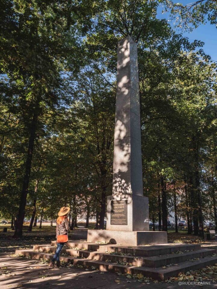 W samym centrum Parku Miejskiego stoi obelisk, pomnik ku czci Tadeusza Kościuszki. Pierwotny obelisk został ufundowany ze składek mieszkańców jeszcze w 1820 roku i prawdopodobnie był to najstarszy pomnik Kościuszki na ziemiach polskich. Oryginał nie przetrwał jednak bombardowań w czasie II wojny światowej, to co widzisz tutaj dzisiaj to rekonstrukcja dawnego pomnika.