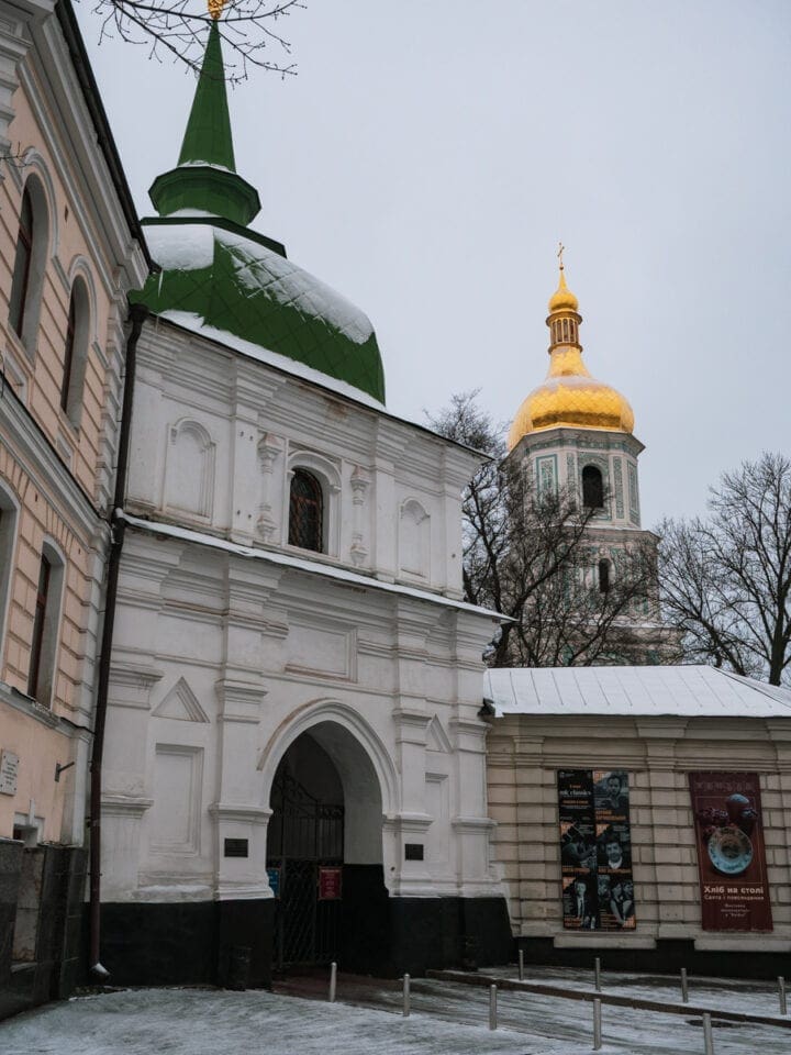 Bardzo ładne miejsce na rozpoczęcie swojej kijowskiej przygody! Co ciekawe, w Kijowie zdarza się, że trzeba płacić za wstęp nawet na sam teren dookoła świątyni. W przypadku Cerkwi św. Zofii na wejściu w kasie masz do wyboru kilka opcji. Możesz wybrać pełen bilet wraz z wejściem do środka cerkwi i budynków na terytorium dookoła cerkwi (20 + 180 UAH), możesz kupić bilet wstępu na sam teren dookoła świątyni (20 UAH) albo zdecydować się na bilet wstępu na teren dookoła cerkwi i wejście na dzwonnicę. My wybraliśmy tą trzecią opcję i kosztowała 20 + 60 UAH.