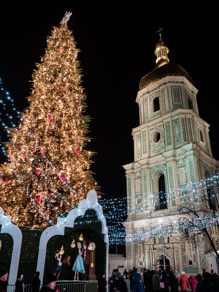 Tuż pod Soborem Mądrości Bożej znajdziesz tzw. plac Sofijski. To właśnie tutaj w okolicy Świąt Bożego Narodzenia i Nowego Roku znajduje się jarmark świąteczny i to tutaj są główne obchody w noc sylwestrową. Dlaczego? O tym powiemy nieco później! Ale jeśli będziesz tutaj w okolicy Świąt (pamiętaj, że kościół prawosławny obchodzi Boże Narodzenie później niż np. w Polsce), zaglądnij tutaj! Kolorowy jarmark świąteczny, aromat grzanego wina, piękne świąteczne dekoracje i choinki! I to właśnie tutaj mieszkańcy Kijowa zbierają się w sylwestrową noc, by wysłuchać przemówienia swojego prezydenta, odśpiewać wspólnie hymn Ukrainy i wznieść toast za Nowy Rok!