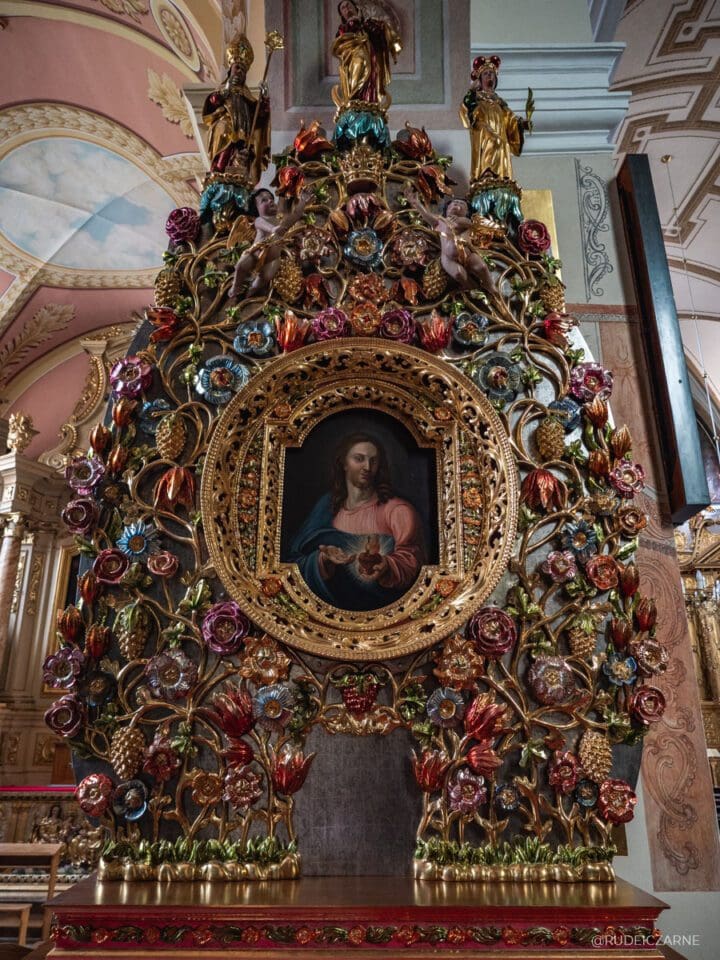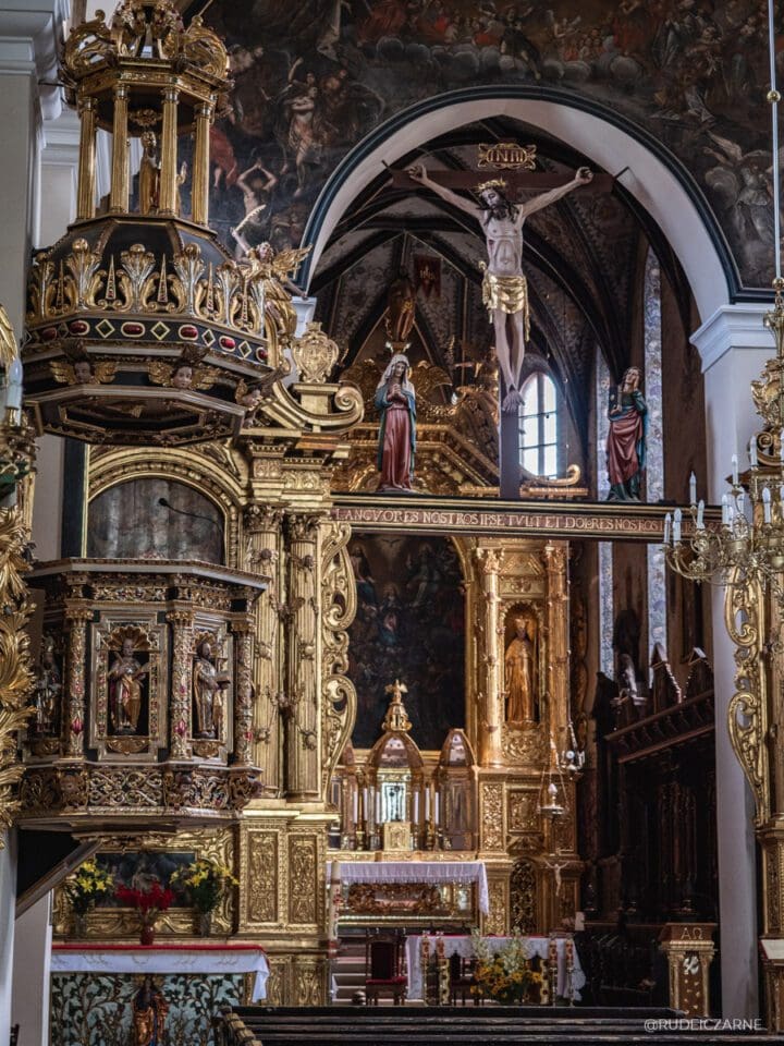 W kościele Farnym widać wszędzie przepych – manieryzm odnosił się przecież do swoistego lęku przed pustą przestrzenią. W tylnej części kościoła zobaczyć także możesz charakterystyczne ołtarze w stylu baroku prowincjonalnego, które przypominają…bombki choinkowe. Co ciekawe, twarz Chrystusa na krzyżu nad ołtarzem w kościele Farnym ma być rzekomo…twarzą samego króla Kazimierza Wielkiego.
