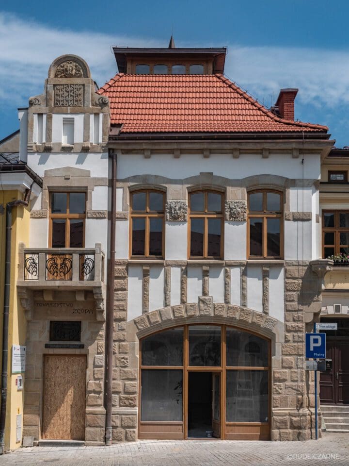 Tak też w 1874 roku w Krośnie powstało Towarzystwo Zaliczkowe, które dziś nazwalibyśmy bankiem spółdzielczym. Miejsce to udzielało pożyczek i kredytów drobnym przedsiębiorcom i rzemieślnikom, a także wspierało rodziny pracowników kopalni. Budynek, który był siedzibą Towarzystwa Zaliczkowego powstał nieco później, w 1893-94 roku i jest wspaniałym przykładem stylu neorenesansowego. Koniecznie zwróć uwagę na przepiękny fryz, który odnosi się do lokalnych symboli – tkactwa, ropy naftowej, znajdziesz tutaj także portrety słynnego naftowego triumwiratu – Łukasiewicza, Trzecieskiego, Kolassy-Zrenckiego.
